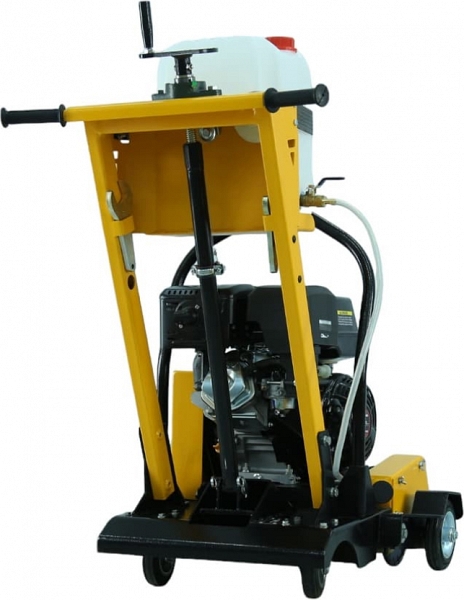 - Вращающиеся вокруг вертикальной оси задние колеса позволяют своевременно и без лишних усилий направлять в нужную сторону и вести криволинейный рез бетона, железобетона, асфальта, повторяя изгиб трещины